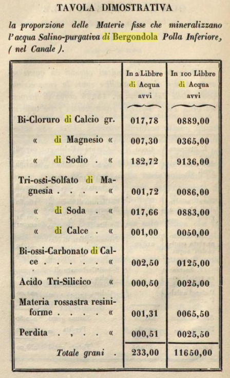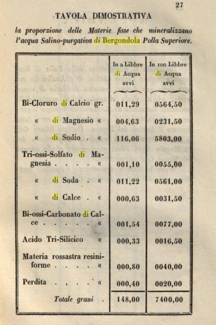 Nella sua relazione finale scrive: "Finalmente in sequela della mia Analisi avvalorata dall ' altra del meritissimo Signor Celi debbo concludere, che le più volte citate Acque di Bergondola anzi che dannose possono essere utili e salutifere : onde possono a mio parere i Medici prescrivere le medesime in tutti quei casi nei quali mirabilmente operano le tanto rinomate Acque della Torretta , Tettuccio (Montecatini) , Tamerici ecc. non che le molte altre delle quali è sì abbondante il nostro suolo Toscano."