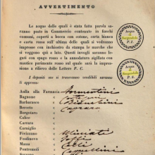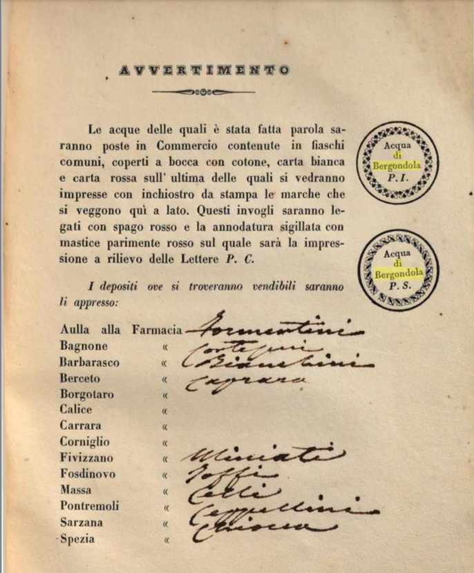 Le acque vengono poste in commercio con i marchi che vedete in figura, imbottigliate secondo questo metodo: "Le acque delle quali è stata fatta parola saranno poste in Commercio contenute in fiaschi comuni, coperti a bocca con cotone, carta bianca e carta rossa sull'ultima delle quali si vedranno impresse con inchiostro da stampare le marche che vedere a lato. Questi invogli saranno legati da spago rosso e la annodatura sigillata con mastice parimente rosso sul quale sarà la impressione a rilievo delle lettere P.C.". Vengono anche elencati i punti vendita.