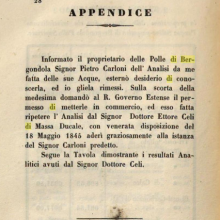 Fatto le analisi di entrambe le acque, Ceppellini scrive "Informato il proprietario delle Polle di Bergondola Signor Pietro Carloni dell ' Analisi da me fatta delle sue Acque, esternò desiderio di conoscerla , ed io gliela rimessi . Sulla scorta della medesima domandò al R. Governo Estense il per messo di metterle in commercio , ed esso fatta ripetere l ' Analisi dal Signor Dottore Ettore Celi di Massa Ducale , con venerata disposizione del 18 Maggio 1845 aderì graziosamente alla istanza