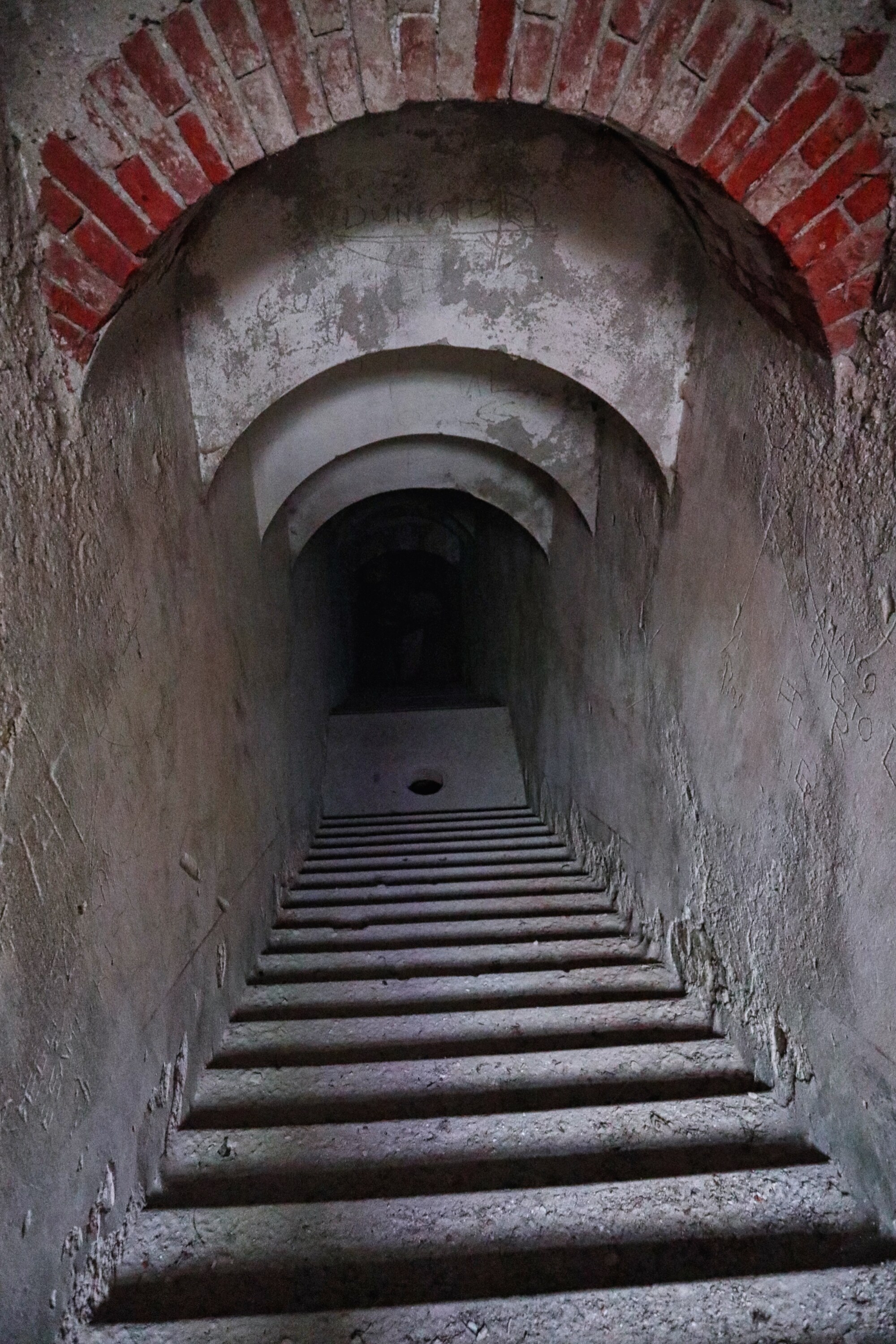 Una visita suggestiva del forte è la caponiera posto a sud, proprio nelle alte mura che stanno in quel versante. Per raggiungerlo è sufficiente scendere a sud del forte, lungo una discesa in mezzo agli alberi fino al raggiungimento di quello che doveva essere il camminatoio sulle mura a sud. Qui, ad un certo punto, si nota una rampa di scale che scende lungo un profondo corridoio. Armati di pila si scende.... c'è una prima scala che scende ripida al buio. Prestiamo molta attenzione ai tombini aperti, presenti lungo il percorso e si arriva in fondo. Il corridoio prosegue in modo pianeggiante tra bocchette di aereazione e pezzi di mura crollate, fino ad un altra breve rampa in salita da cui si accede al bunker. Da qui si vedono le feritoie che guardano i lati delle mura e pensiamo a quanto doveva essere difficile e dura la vita del soldato.