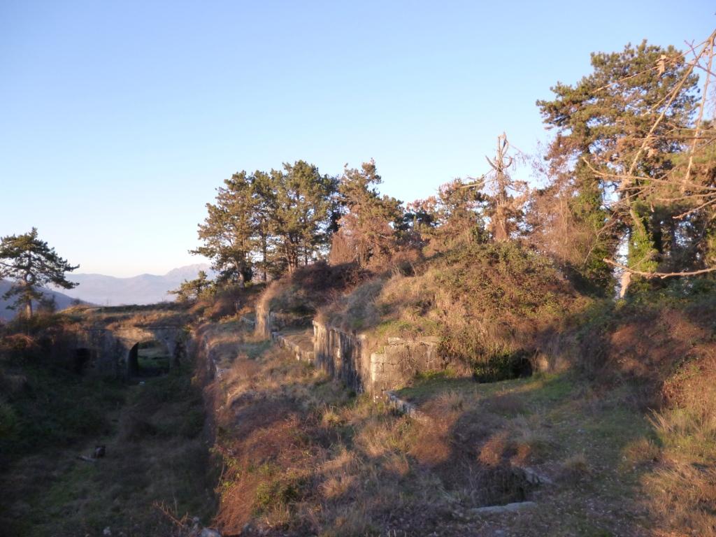 Decidiamo di guardare anche l'esterno del bunker. Usciamo dal forte e ci dirigiamo a sud di esso, risaliamo contro le mura e giriamo attorno, tra rovi e vegetazione fitta. Ad un certo punto, arriviamo di fronte alle feritoie. Mi colpisce molto vedere i segni delle pallottole che hanno scalfito le mura intorno alle singole feritoie.