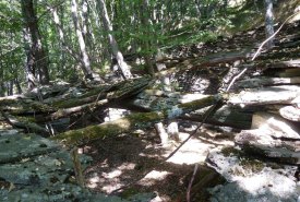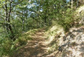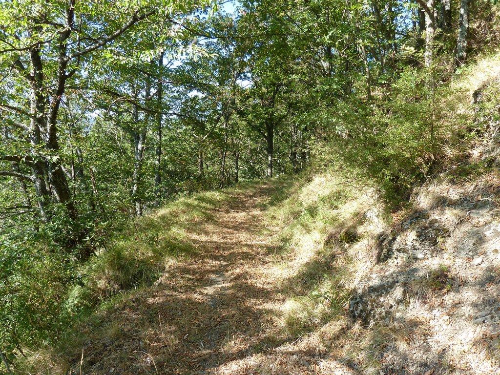 Salendo si vedono tratti di castagneto seriamente danneggiati dal cinipide galligeno, un parassita “importato” dalla Cina. La mulattiera sale velocemente verso un bivio, proseguo sulla destra in un tratto pianeggiante. Per un lungo tratto si continua ad attraversare il castagneto. Se si è attenti si vedono tracce di muretti a secco e di contenimento. In particolare questi ultimi, sono quelli a forma semicircolare costruiti attorno ai castagni da frutto.