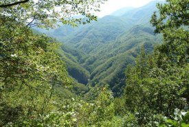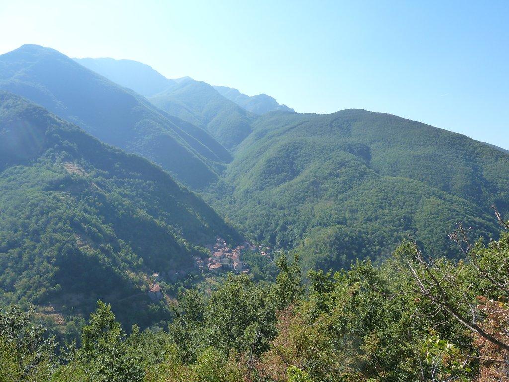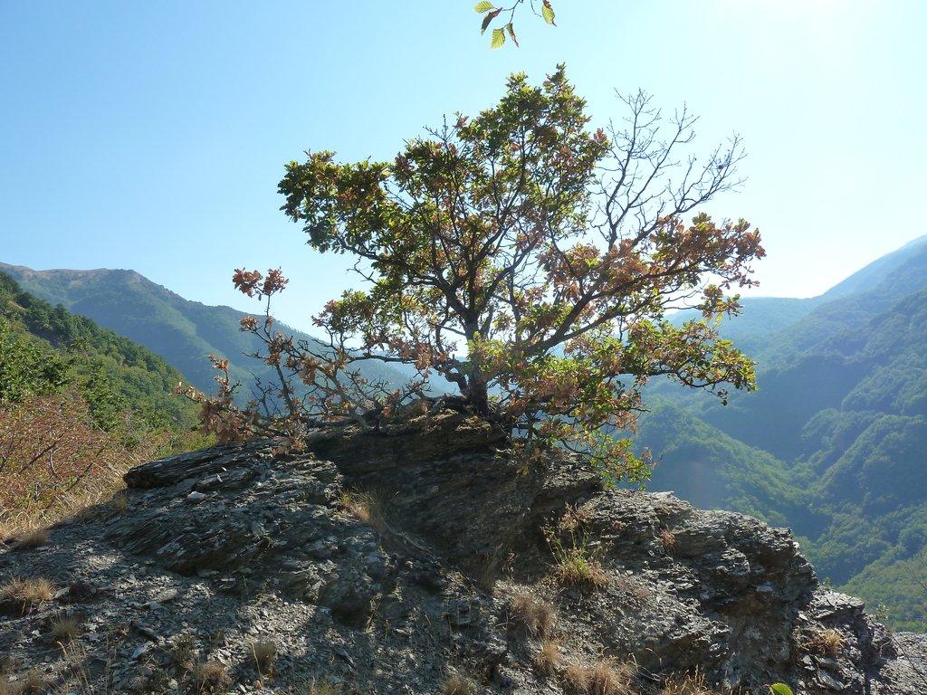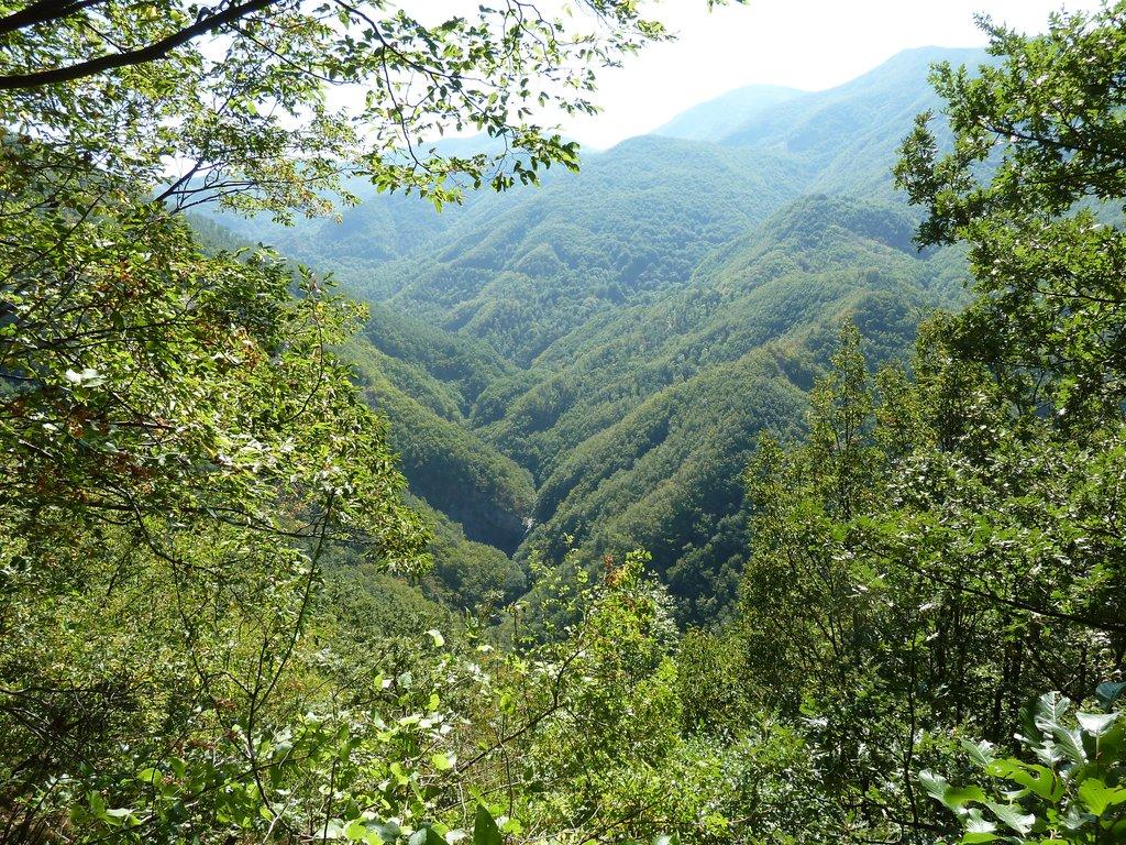 Adesso il sentiero incrocia una strada sterrata, è la stessa che abbiamo percorso nel primo tratto del paese, dove abbiamo preso l'acqua della fonte. Seguo lo sterrato che sale ripido tra due speroni di roccia. Di fronte ci sono i passi appenninici, sulla destra Pracchiola e la Valdantena e sulla sinistra si vedono altre vette..... sono totalmente inglobato dal verde. Questo non è un percorso di transito di turisti ne è segnalato da alcuna guida, la sensazione di solitudine con se stessi qui è reale. Solo la sterrata dà un senso di collegamento con il paese.... l'unico cordone ombellicale con la "civiltà". Tempo di bere un po' d'acqua, ascoltare e guardarsi intorno.... con me c'è solo il vento. Il bello di questo posto è proprio la consapevolezza di non incontrare nessuno, di essere "soli con la natura"..... anzi "in compagnia della natura".