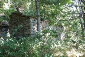 Decido di tornare sui miei passi per trovare una zona meno disagevole per la salita ai prati. Incrocio quel che resta di tre cascine costruite vicine tra loro. Salgo nel bosco sopra di esse. La salita è ripida, ormai non seguo alcun riferimento a parte il punto che ho contrassegnato sulla mappa. Da qui si osserva un sentiero lastricato che va verso il passo. Lungo questo percorso si incontrano altre cascine costruite ai bordi della mulattiera. Sono tutte in pessime condizioni e diroccate.